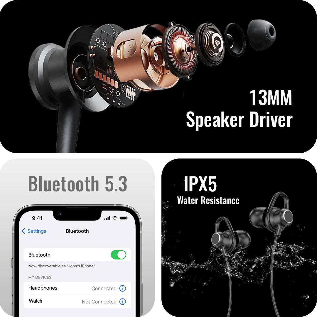 Battery Life: 40 hours of playback. Bluetooth 5.0: Stable connection with a range of up to 12 meters. IPX Water Resistance: Protected against splashes and rain. Vibration Alerts: Notifies you of calls and notifications via vibration. Magnetic Earbuds: Tangle-free, easy storage. Built-in Microphone: Clear, noise-free calls. USP: Long Battery Life: 40 hours of continuous playback. High Bass Sound: 10mm dynamic drivers for deep bass and clear sound. Comfortable & Lightweight: Ergonomic design for long-lasting comfort. Water Resistance: IPX-rated for workouts and outdoor use.