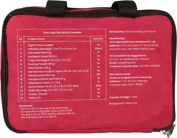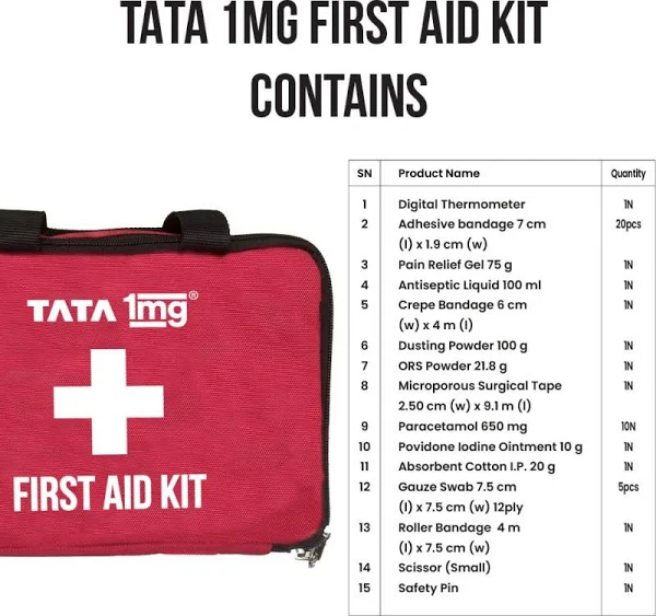 Information about Tata 1mg First Aid Kit Tata 1mg First Aid Kit contains different medical supplies, which can provide primary care during any injuries or accidents before proper medical care is available. Product Details: The box contains items like Medicated first aid dressing, Digital Thermometer, Antiseptic Solution, Cotton Roll, Micropore Tape, Crepe Bandage, Gauze Bandage, Roller Bandage, Pain Relief Gel, Scissors Cipladine Cream, Absorbent Cotton Wool, Paracetamol Tablet Uses: The kit box can be used to manage injuries, stop bleeding, minimize sprains, and other minor conditions Product Specifications and Features: Light-weight design and easily portable It is made of polyester fabric and is waterproof It has a separate mesh pouch Directions for use: Use as and when required Safety Information: Read the label carefully before use Store in a cool and dry place Keep out of reach of children