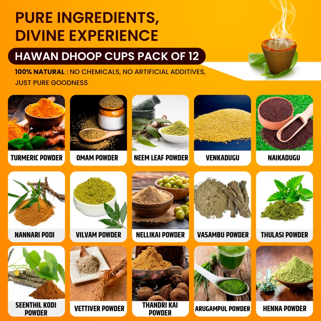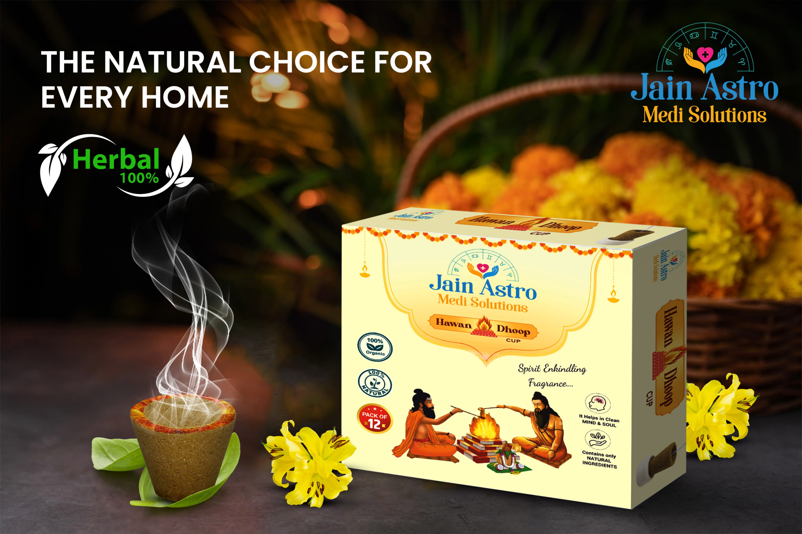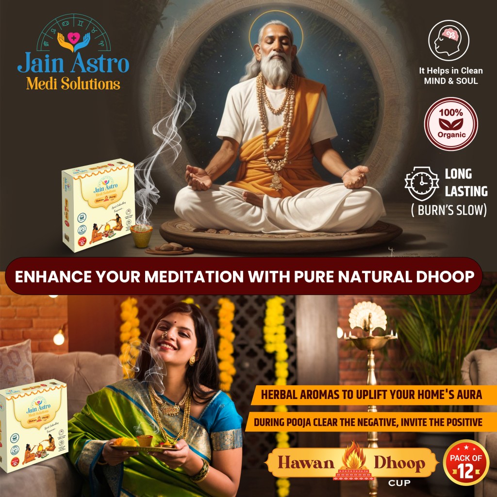 Experience the Divine with Jain Astro Hawan Dhoop Cups Crafted with a blend of sacred and natural ingredients, Jain Astro Hawan Dhoop Cups bring purity and positivity to your spiritual rituals. Each cup is infused with: Turmeric (Curcuma longa): Renowned for its cleansing and protective properties. Omam (Trachyspermum ammi): Known for its soothing and purifying essence. Neem (Azadirachta indica): A symbol of purity, neem dispels negativity. Venkadugu & Naikadugu (Sinapis alba, Cleome angustifolia): Traditionally used to ward off evil and enhance focus. Nannari (Hemidesmus indicus): Offers a refreshing and grounding aroma. Vilvam (Aegle marmelos): Sacred to Lord Shiva, bringing auspiciousness. Nellikai (Phyllanthus emblica): Known for its energizing properties. Vasambu (Acorus calamus): Enhances tranquility and concentration. Thulasi (Ocimum tenuiflorum): Fills the space with divine energy. Seenthil Kodi (Tinospora cordifolia): A herb of rejuvenation and healing. Vettiver (Chrysopogon zizanioides): Imparts a calming and earthy fragrance. Thandri Kai (Terminalia bellerica): Adds a spiritual and grounding touch. Arugampul (Cynodon dactylon): A sacred grass with purifying qualities. Henna (Lawsonia inermis): Promotes peace and harmony in the environment. Light a Jain Astro Hawan Dhoop Cup to invite serenity, positivity, and divine blessings into your home. Perfect for daily prayers, special rituals, and festive occasions