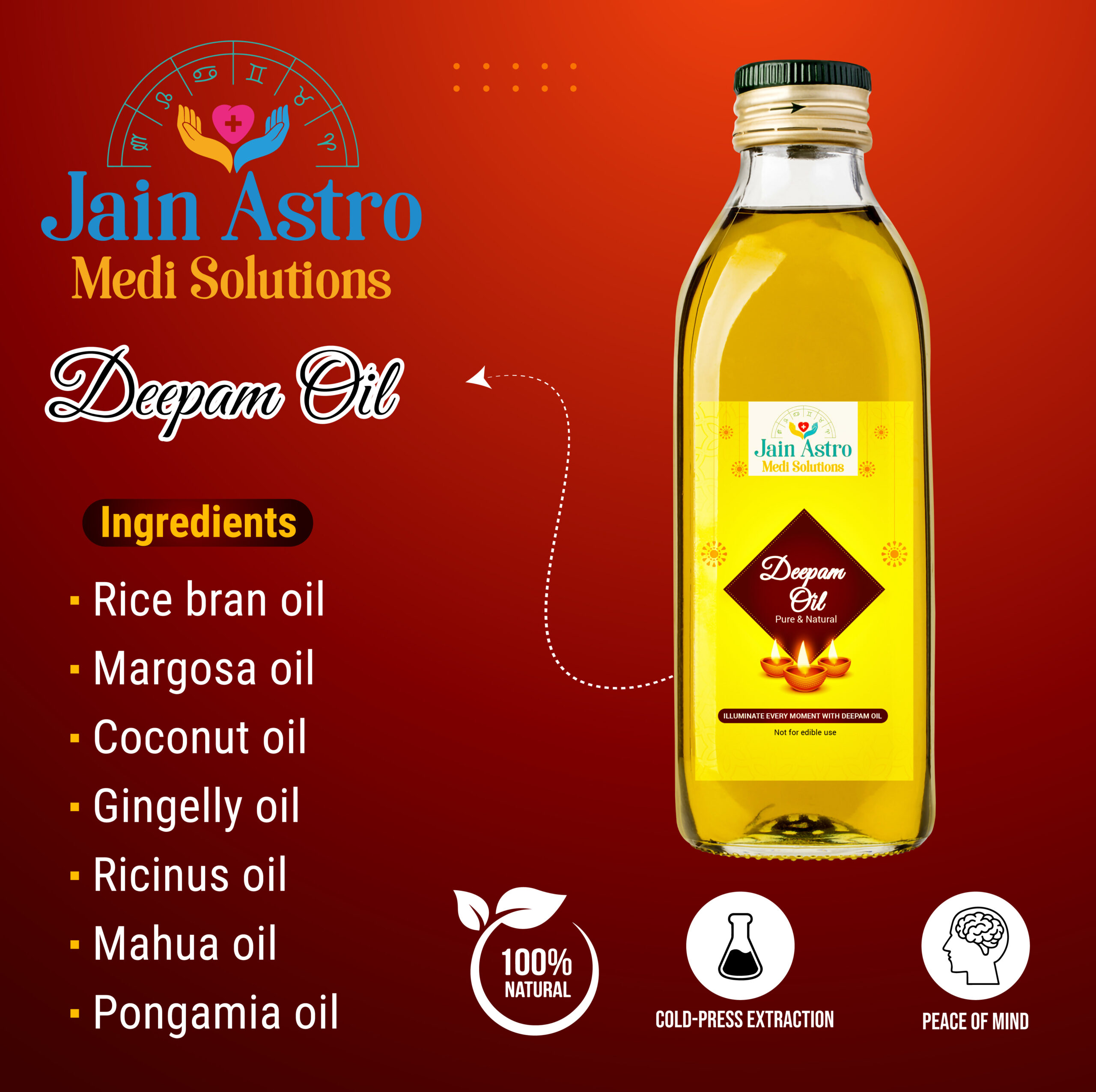 Benefits Religious and cultural practices – oil lamps are often used in religious & cultural ceremonies. Festivals and celebrations many festivals involve the use of oil lamps Meditation and yoga in some spiritual practices, oil lamps are used during meditation or yoga sessions to create a serene and focused atmosphere. Jain Astro Medi Solutions Deepam Ou Pure & Natural ILLUMINATE EVERY MOMENT WITH DEEPAM OIL Not for edible use Ceremonial offerings – oil lamps may be used as part of ceremonial offerings or rituals, symbolizing purity and devotion.