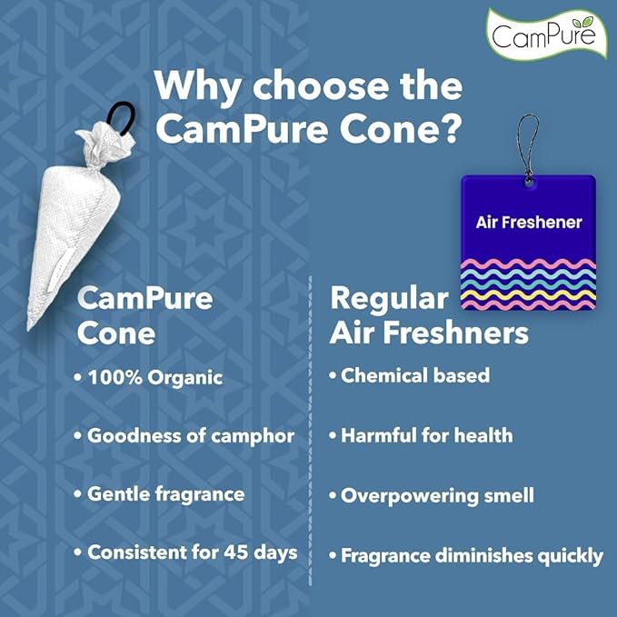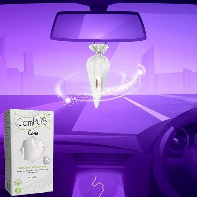 TWO IN ONE BENEFIT: Unlike conventional products which are either a fragrance or a repellent, CamPure Camphor Cone is both: It provides a REFRESHING FRAGRANCE, REPELS MOSQUITOES and even ELEVATES MOOD. CamPure Camphor Cone does not consist of any fillers, additives or bases. FIRST OF ITS KIND: The scent spreads quickly to neutralise and remove unpleasant odours, protects you from mosquitoes – flies – insects and preserves your clothes from dampness and moth infestations. LONG LASTING: Hang the camphor cone by its elastic band in your home, office or vehicle. For the next 45 days experience a unique camphor based fragrance which has the abilities to keep you fresh and healthy. The product has a shelf life of 5 years when unopened. NO DANGEROUS CHEMICALS – SAFE AROUND CHILDREN: CamPure Camphor Cone is made from an extract of the pine tree and is therefore a NATURAL and ORGANIC product. There is no harmful toxic chemicals such as DEET, PDCB, Napthalene or any other petrochemicals which are potentially cancer causing (carcinogenic) CERTIFIED: In most European countries the above dangerous chemicals which most available fragrances/repellents are based on are banned. In place the countries use Camphor which is known to keep one healthy from diseases such as Malaria, Dengue, H1N1, Swine Flu, chikungunya, yellow fever etc. CamPure Camphor Cone is also eco-friendly
