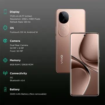 Key Features Display: 6.77 inches (17.20 cm), AMOLED, 120 Hz Refresh Rate Memory: 8GB RAM, 128 ROM Processor: MediaTek Dimensity 7300, Octa Core, 2.5 GHz Camera: 50 MP + 8 MP Dual Rear Camera & 50 MP Front Camera Battery: 5500 mAh with 80W Fast Charging USP: AI Portrait Suite, In-display Optical Fingerprint Sensor, IP64 Dust & Water Resistant