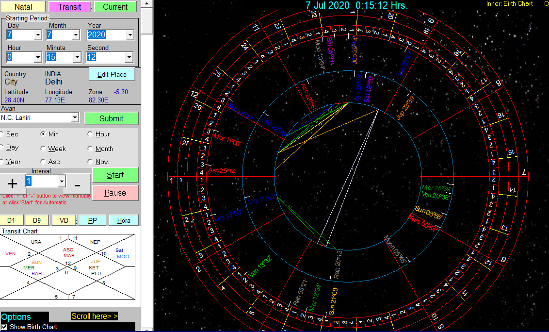 - Interactive Chart Study: The Birth Chart is specially designed to give you information about the planet on chart itself. Also there is no need to click any planet. Just take your mouse to the desired planet on chart, and you will get its information like Drishti, Nakshatra lord, sublord, nakshatra etc. Nakshatra and degrees are also aligned along with planets. This helps you to quickly analyse chart, as shown in image below... It is also useful for beginners to study charts quickly. Also as always in Kundali Chakra, it features special chart rotation feature, i.e. when you click on any rashi... to make it lagna, thus can study various houses and subjects easily.